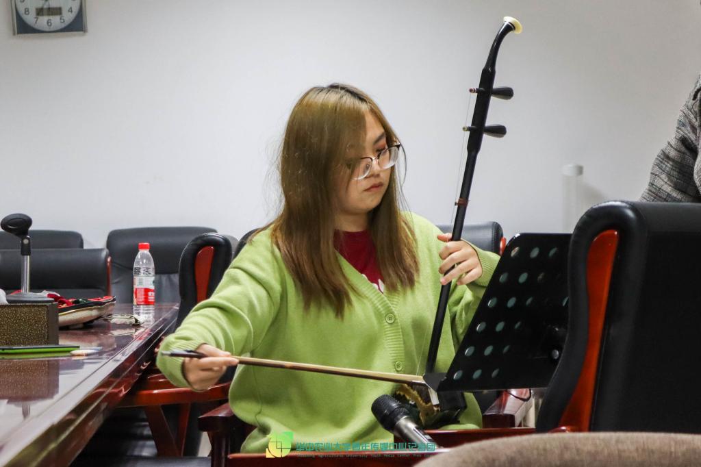 弹筝奋逸响,新声妙入神。作为深受广大人民的喜爱的一种传统乐器,古筝音色优美,音域宽广,具有相当强的表现力。在交流会的最后,古筝演奏者陈思瑶弹奏了一曲《西部畅想曲》。乐曲节奏、速度和力度变化快,具有浓郁的西部风格特征。既表现了柔婉细腻的西域风情,也刻画了粗犷豪放的西部地域风貌。