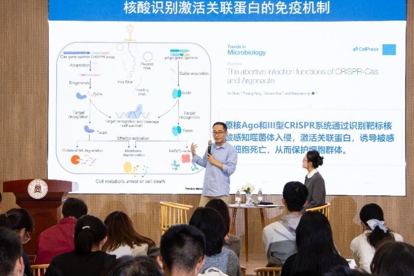 互动交流环节中,同学们围绕科研入门、技术转化、机制解析等方面踊跃提问。针对原核免疫机制的转化前景,韩文元介绍了基于效应蛋白COM BC与信号分子DIPTP的检测工具开发,以及非典型氨基酸研究带来的新启示。此外,韩文元还就细菌免疫系统机制解析的难点、课题推进策略及技术协作经验等话题与同学展开交流。