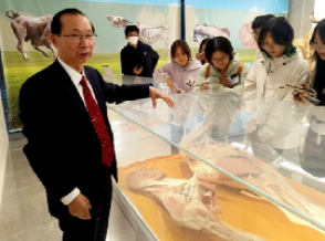 专题讲座结束后,彭教授带领同学们移步动物医学标本馆,开展现场教学与互动交流。在观察牛、马等动物的骨骼、肌肉及内脏标本时,他引导大家将书本知识与立体结构对应起来,建立准确的解剖学概念。谈及牛没有上切齿的特征,彭教授分享了一个有趣的典故:“传说牛为了参加重要聚会向毛驴借角,事后拒不归还,愤怒的毛驴便踢掉了牛的上牙。”这一生动讲述,让同学们在轻松氛围中加深了对解剖特征的理解。
