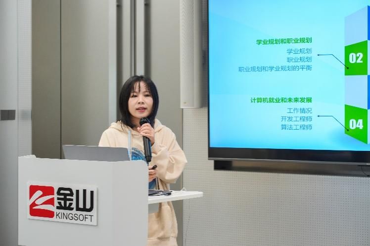 在随后的报告厅互动环节,华农信息学院优秀毕业生龚帅以“校友 + 职场人”的双重身份,分享了自己从校园到职场的成长历程。她也详细介绍了金山软件的人才培养体系、晋升通道与福利待遇,重点回应了同学们普遍关心的职业规划问题。“尽早明确方向,大胆尝试实践,在积累中找准自身定位”,龚帅结合自身经历给出的建议,让在场学子深受启发。