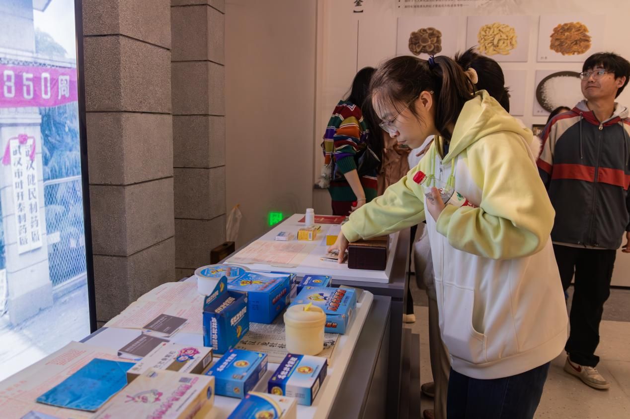 作为具有近四百年发展历史的中华老字号,叶开泰自开号起便采用“前店后厂,医药合一”的运行模式。展区以其创始时期的汉口街药铺为原型,通过建筑形制、器具还原等方式复现出实景体验空间。同学们走近诊脉桌、药柜,触摸泛丸竹匾与老药秤,身临其境地感受叶开泰的传统经营模式;店堂悬挂的“修合虽无人见,存心自有天知”的金匾复制品,也让同学们直观体会到其“以诚制药”的精神内涵。