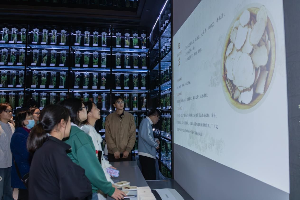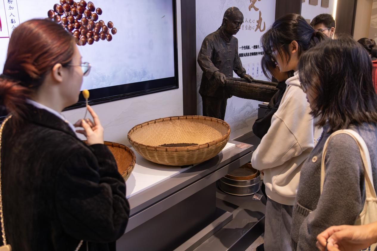 最后一个展区聚焦“中医传统制剂方法”这一国家级非遗项目,展示了九秘膏方、手工泛丸和四制老酒三大技艺。展区通过呈现传统制剂的技艺标准,结合动画演示与实物还原,让同学们直观感受到非遗技艺匠心传承。