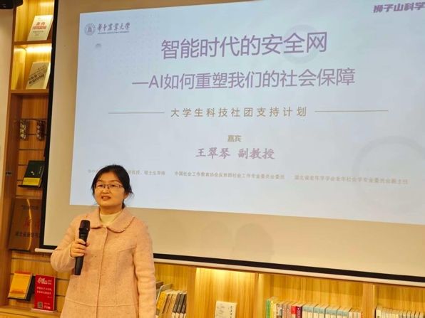 11月18日,“大学生科技社团支持计划”狮子山科学汇学术沙龙系列活动在倍阅书店顺利举行。文法学院王翠琴副教授以“智能时代的安全网——AI如何重塑社会保障”为主题,为现场同学系统解读我国社会保障制度,剖析AI对这一领域的深远影响,搭建起理论与现实交融的学术交流平台。