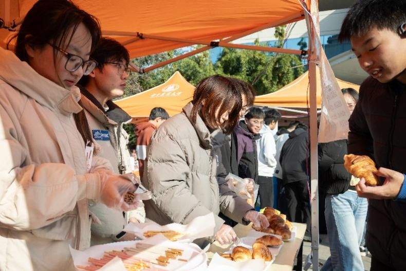 循着诱人的烘焙香气,食品科技协会的展台前早已排起长队。金黄酥脆的可颂刚刚出炉,空气中弥漫着幸福的甜香。“我们的可颂特别采用了减糖配方,”协会负责人、食工2302严琦洲同学一边分发样品一边讲解,“既要美味,也要健康,这正是食品科学的魅力所在。”在这里,同学们不仅可以品尝到由社员亲手制作的减糖可颂,还能通过趣味问答学习食品科学知识。
